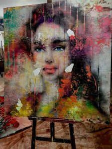 تبدو العينان شاخصتين نحو البعيد، وكأنهما تتبعان شيئًا لا يُرى، شيئًا تشكّل خلف انسكاب الألوان. تسيل الخطوط، تندلق الألوان، تتراكم الطبقات الزيتية والأكريلية دون حساب… هنا، لا مكان للبخل الفني، بل للبذخ الروحي. فالفنانة، كما اعتادت، لا ترسم بالألوان فحسب، بل ترميها، تُلقي بها، تُفجّرها فوق السطح، كما لو كانت ترمي قلبها.