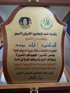 يتشرف اتحاد الإعلاميين الإفريقي الآسيوي بإهداء درع التميز للدكتورة ليلى موسى، تقديرًا لجهودكم المتميزة وعطائكم الكبير وتاريخكم المشرف في خدمة الإنسانية وقضايا الأمة الإفريقية الآسيوية.. مع أصدق الأمنيات وخالص التقدير والعرفان.