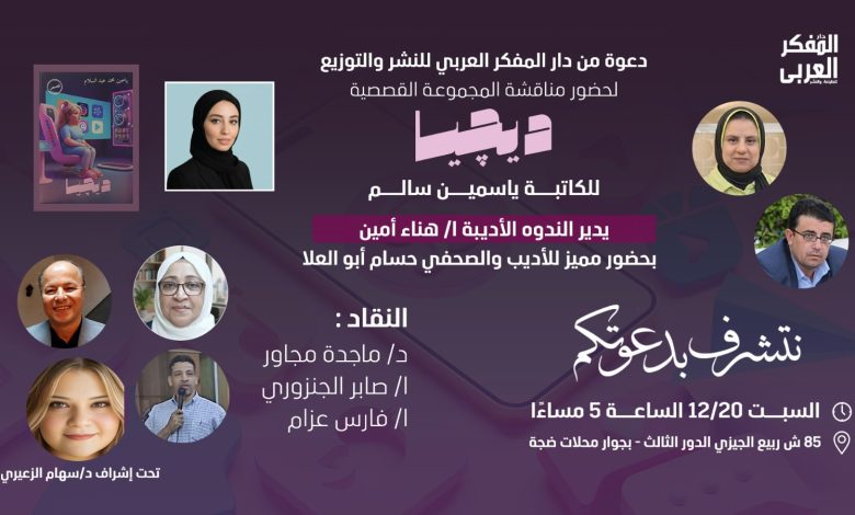 يستضيف دار ومنتدى المفكر العربي، مساء السبت المقبل الموافق 20 ديسمبر، أمسية أدبية لمناقشة المجموعة القصصية «ديچيا» للكاتبة ياسمين سالم، وذلك بمشاركة نخبة من الأدباء والكتاب والمفكرين والمثقفين والإعلاميين.