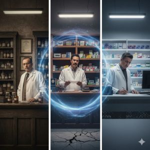 استعدت توازني وفتحت عيوني وافقت على حقيقة من أعجب الغرائب، كانت الصيدلية قد عادت لشكلها القديم، ارفف خشبية بنية اللون، مكتب قديم، حتى الأدوية التي انتهت تصنيعها عادت مرة أخرى، ما هذا العبث؟، سرعان ما لفت انتباهي شيء هام، أن باب الصيدلية مغلق بالباب القديم، صرخت في جنون ، كل هذا انا غيرته منذ عشر.. عشر… عشر سنوات، ألهث وأنا انطقها، نعم كانت صيدلية مملوكة لصيدلى قديم واشتريتها منه وغيرت الديكور والمكتب والباب واستبدلتها بالشكل الحديث، لفت انتباهي وجود برواز معلق، نعم، أنها رخصة دكتور سيد الشوربجي، فغر فاهِ من الدهشة، كل شيء تبدل، هل سافرت عبر الزمن؟، أكاد أجن، هدأت لأعيد التفكير، بعد أن تبخرت غشاوة الاضطراب من فوق عيني وجدت الكرتونه كما هي، هرعت إليها لأفتح علبة أخرى قد تعيدني إلى زمنى وبالفعل كما العلبة السابقة، فارغة وبها ورقة مطوية.