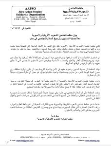 وفي ختام بيانها، دعت منظمة تضامن الشعوب الأفريقية الآسيوية جميع الأطراف المعنية إلى ضبط النفس، ووقف العمليات العسكرية التي تمس المدنيين، والعمل على تهيئة مناخ جاد ومسؤول للحوار والمفاوضات، بما يراعي المصالح العليا للشعب السوري وحقه المشروع في الأمن والسلام والاستقرار..